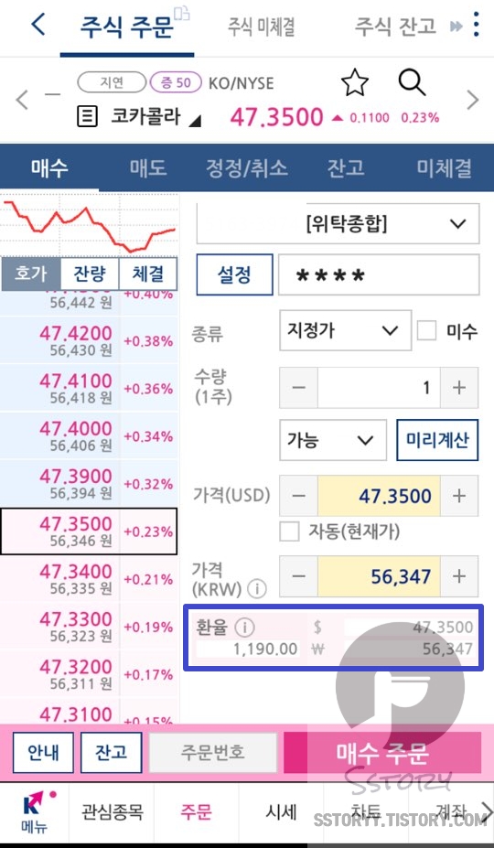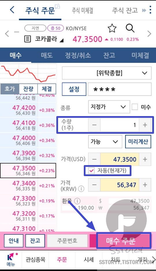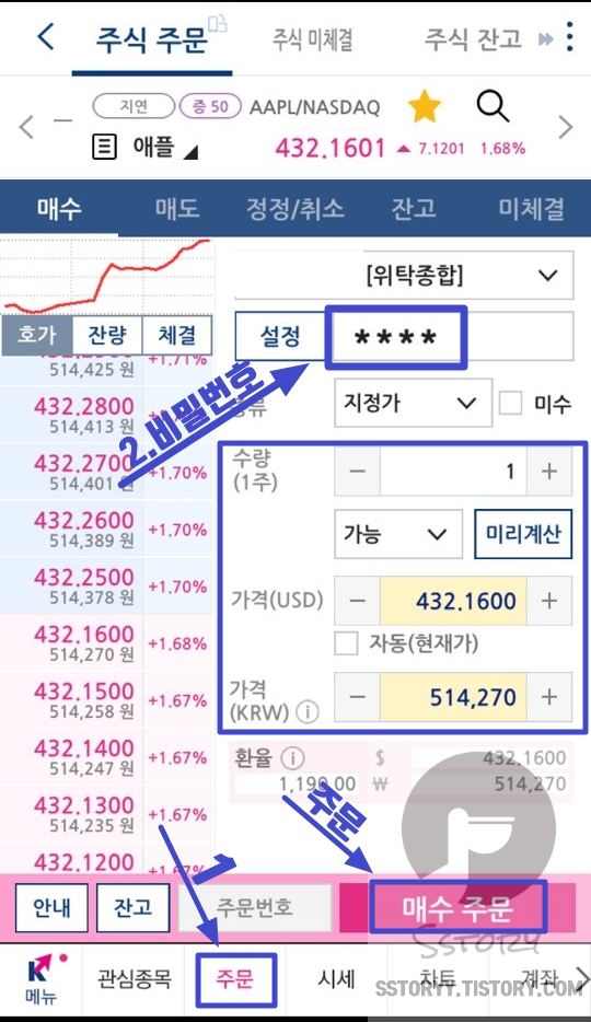 2) 주문창으로 들어오면 일단 비밀번호를 입력합니다. 그리고 아래에 수량과 가격을 입력할 수 있습니다.