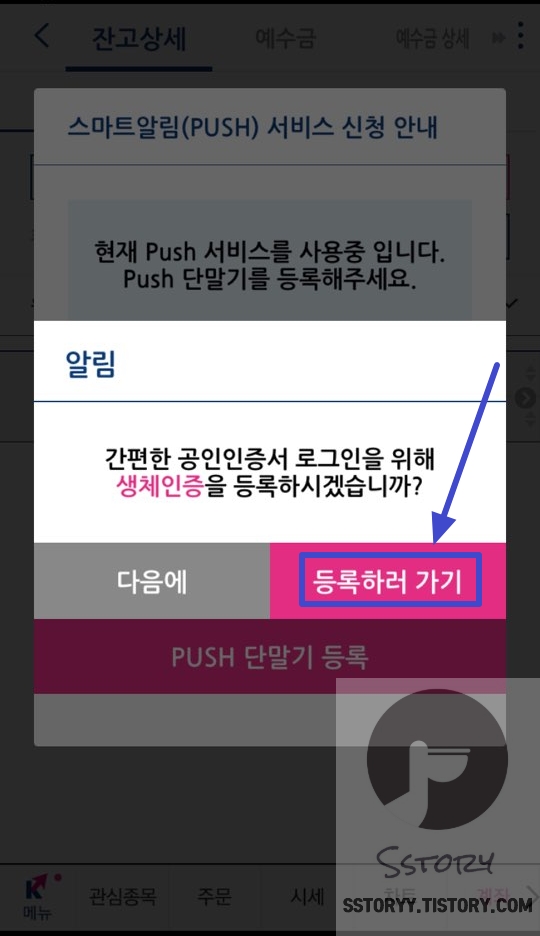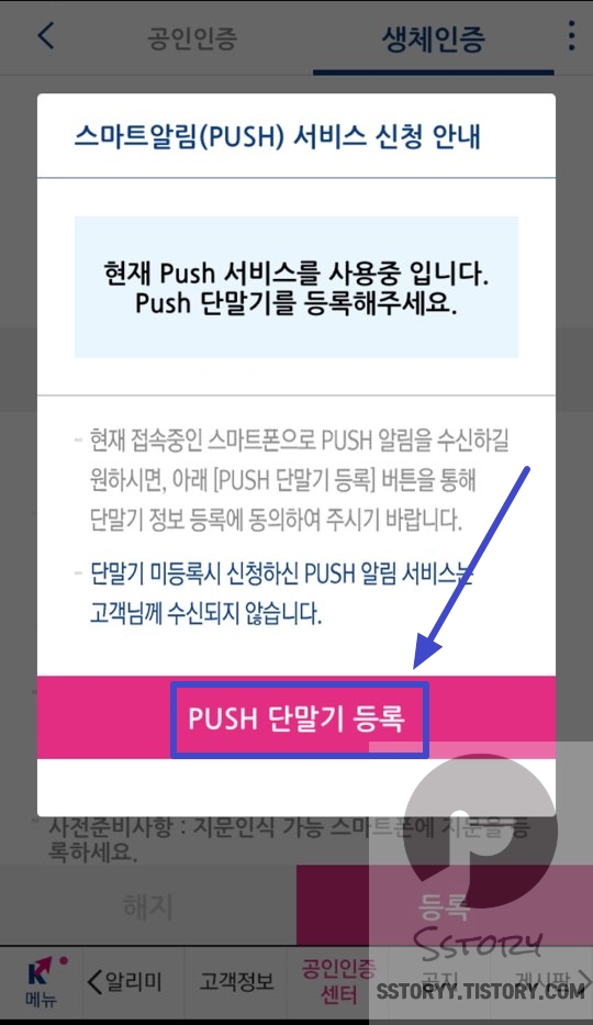 생체인증 등록은 등록하러 가기-PUSH단말기 등록-확인-생체인증 등록-지문인증 등록 의 순서로 진행하면 됩니다. 헷갈리시면 아래 사진의 순서로 진행하시면 됩니다. ▼