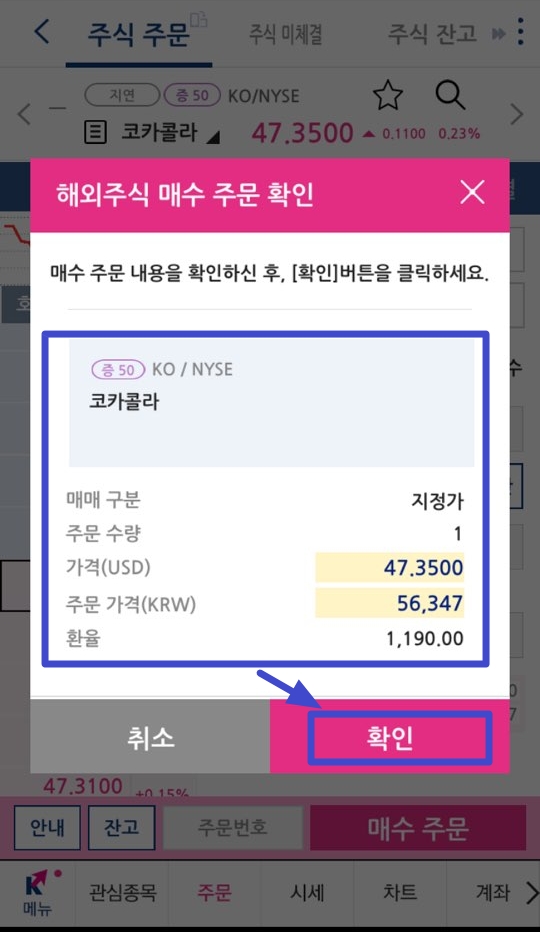 3) 원하는 매수 수량과 가격을 입력한 뒤 매수주문 버튼을 클릭하고, 확인 버튼을 누르면 매수가 진행됩니다.