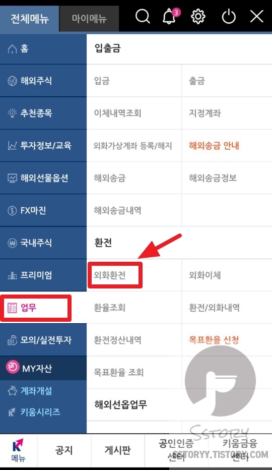 1) 홈 화면에서 좌측 하단의 메뉴-업무-외화환전의 순서로 진입합니다. ▼
