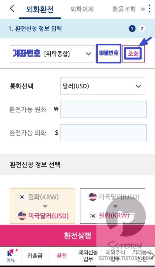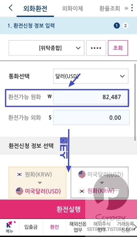 2) 외화환전 창에서 계좌번호 우측의 빈칸을 클릭하여 비밀번호를 입력하고 [조회] 버튼을 클릭합니다. 그럼 환전가능한 원화가 조회됩니다. 현재 82,487원 만큼의 달러를 살 수 있다는 이야기입니다. 스크롤을 아래로 내려줍니다. ▼