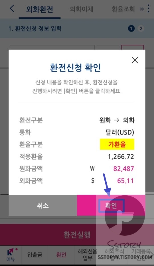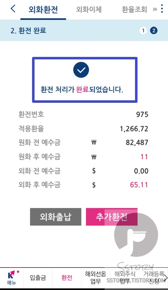4) 환전신청 확인 창에서 확인버튼을 누르면 환전처리가 완료됩니다. ▼