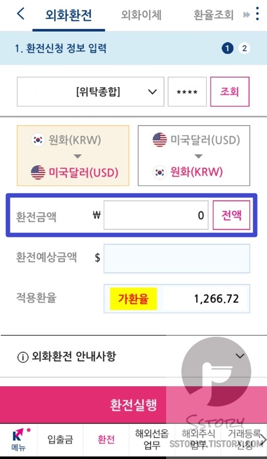 일단 우리는 미국주식을 매수해야 하기 때문에 [원화 ▶ 미국달러]가 선택된 상황에서 필요한 환전금액을 입력합니다. 전액 환전을 해야할 경우 [전액] 버튼을 클릭하면 자동으로 내 계좌의 전액이 입력됩니다.