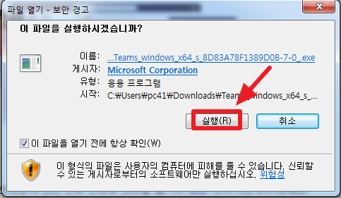 3) [실행] 버튼을 클릭하여 설치파일을 실행합니다.