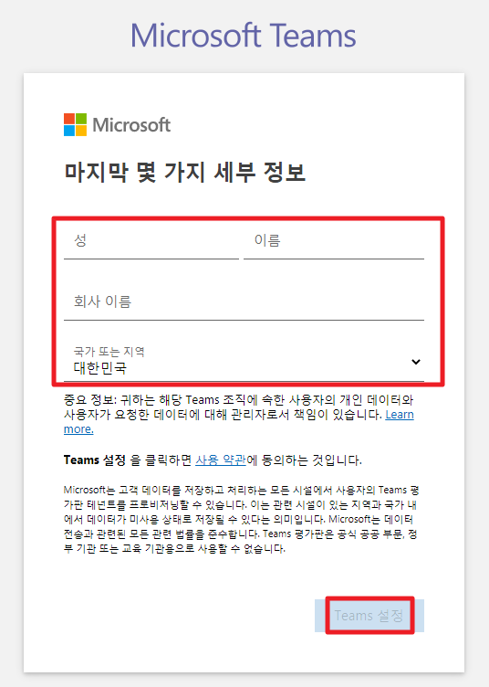 9) 이름과 회사 정보를 입력한 후 [Teams 설정] 버튼을 클릭합니다. ▼