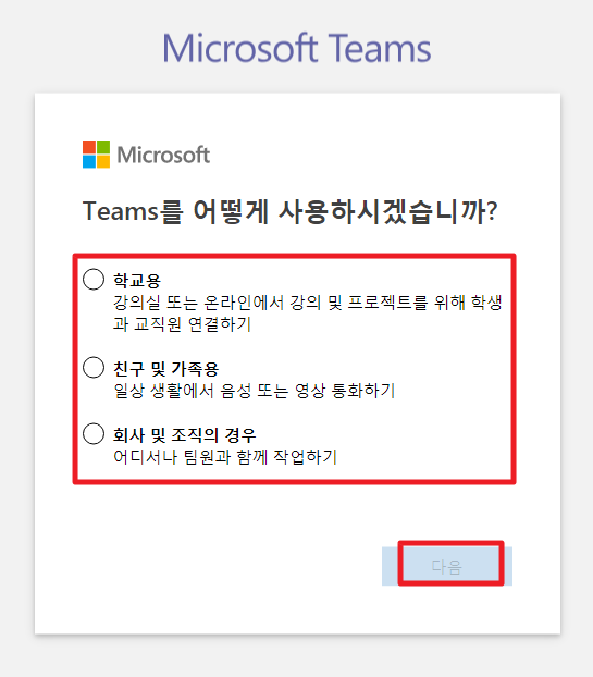 8) [Teams]의 용도를 설정하고 [다음] 버튼을 클릭합니다. 저는 [회사 및 조직의 경우]를 클릭했으며 다음 창에서 암호입력 후 [로그인] 버튼을 클릭합니다. ▼