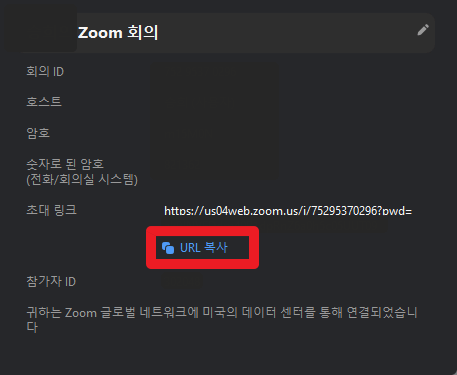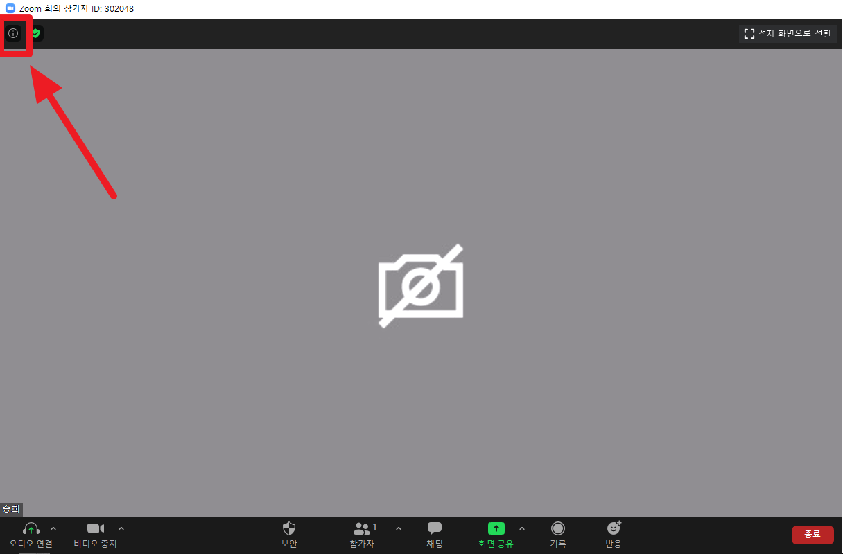 1) 우측 상단의 동그라미 아이콘을 클릭하면 회의 정보가 나타납니다.초대 링크의 URL을 복사해서 초대할 사람에게 보내주면 됩니다. ▼