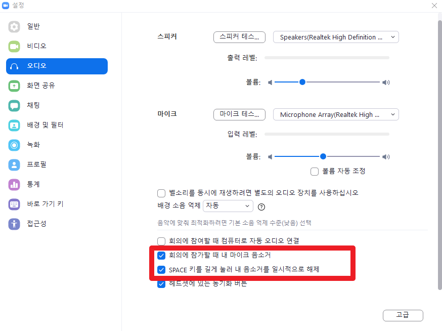 그 밑에 'SPACE 키를 길게 눌러 내 음소거를 일시적으로 해제' 옵션이 있습니다. 이 옵션을 체크하면 내가 말할 차례가 되었을 때 스페이스바를 길게 누르고 있으면 내 음성이 정상적으로 출력됩니다. ▼