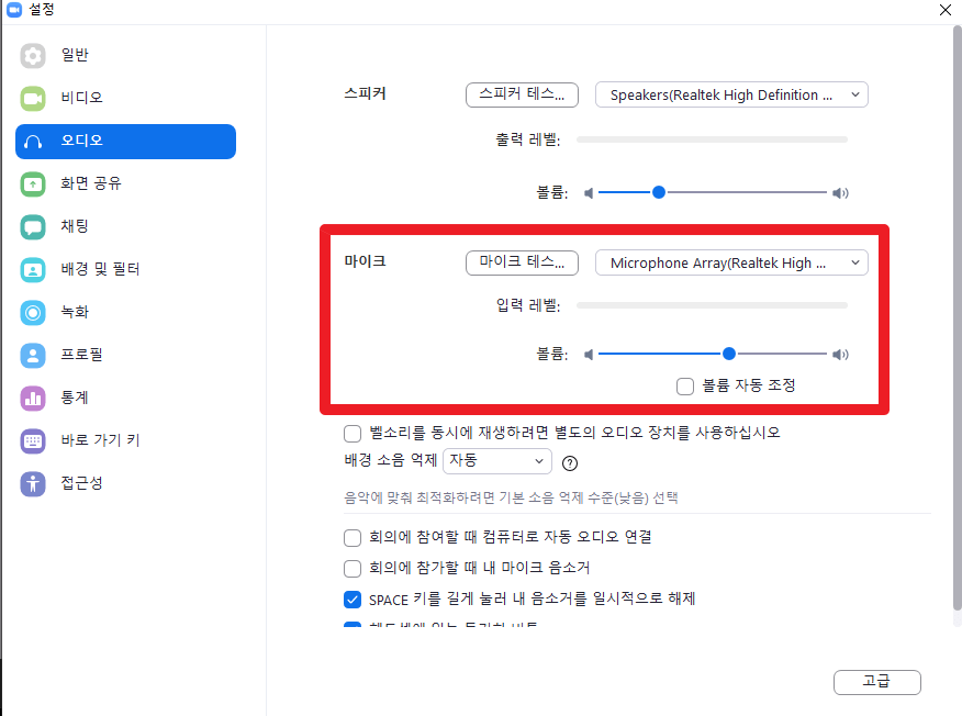 마이크 볼륨 버튼 아래를 보시면 '회의에 참가할 때 내 마이크 음소거' 옵션이 있습니다. 이 옵션에 체크하시면 기본적으로 회의 중에 내 마이크가 음소거가 됩니다.