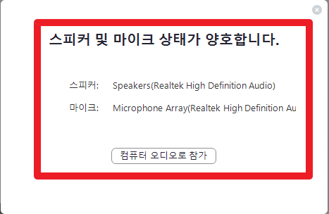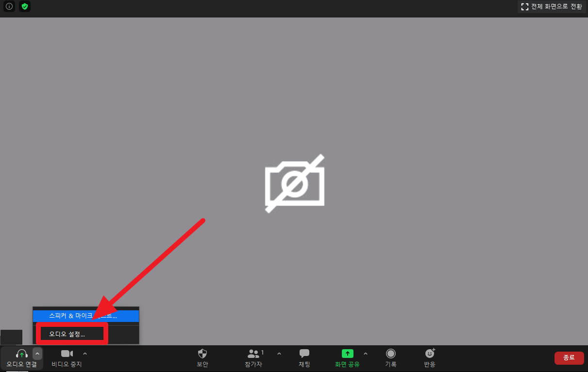 회의 전 필히 스피커와 마이크를 테스트해야 합니다. 회의를 시작하였는데 스피커가 작동하지 않아 상대방의 소리가 들리지 않거나 내 마이크가 작동하지 않아 내 음성이 출력되지 않는다면 굉장히 당황스러운 상황이 발생할 수 있습니다.