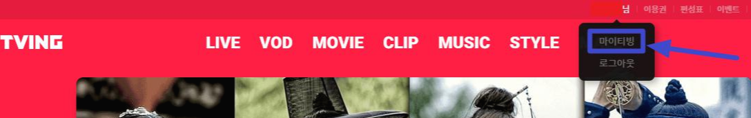 2) 계정버튼을 클릭하면 메뉴가 나타납니다. 마이 티빙 버튼을 클릭합니다. ▼