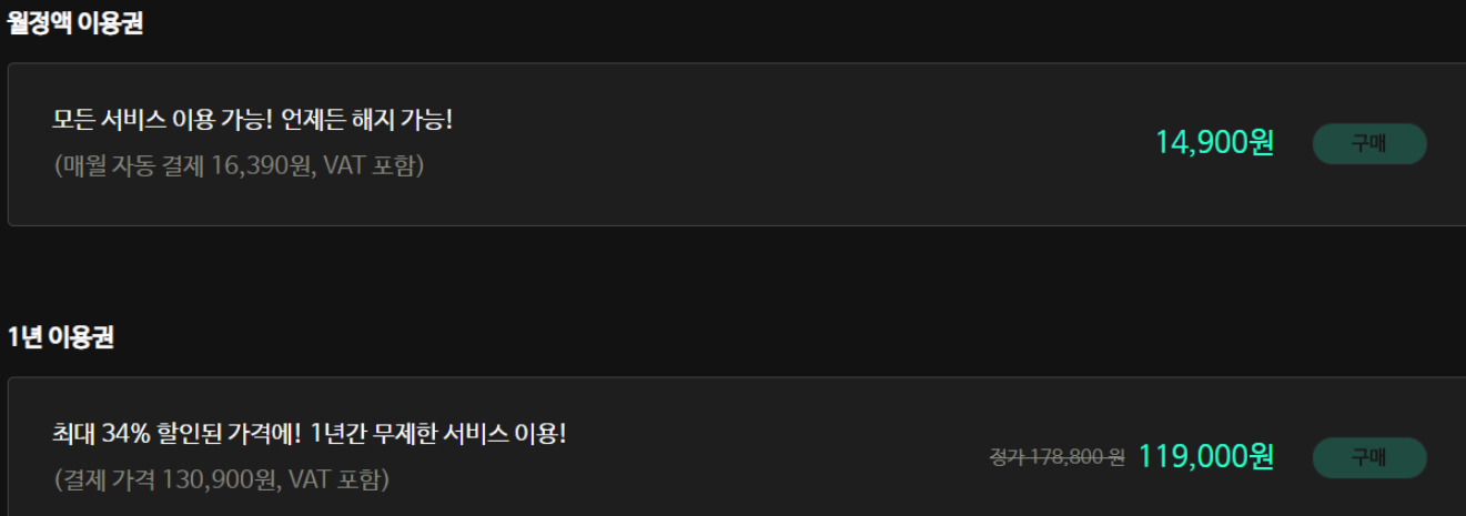 조금 여유가 있어 월정액 이용권을 구매하실 수 있는 분이라면 확실히 편리하게 유로파리그 중계를 시청하실 수 있습니다. 모든 서비스 이용 가능한 월 이용권은 14,900원, 1년 이용권은 34% 할인된 가격인 11만 9천 원으로 시청하실 수 있습니다. 월 정액 이용권은 결제 후 언제든 해지가 가능하므로, 시청해보시고 마음에 안 들면 해지하셔도 되겠습니다.