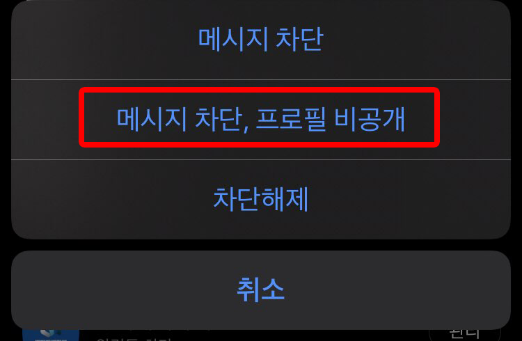 2) [메시지 차단, 프로필 비공개]을 선택하면 상대방 메시지가 차단 되고,
