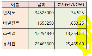 오늘은 엑셀 천단위 절사, 천 원 단위 표시하는 방법을 알아보았습니다.