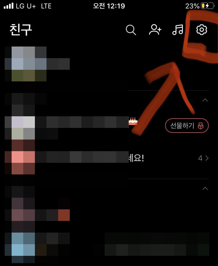 1) 친구목록에서 [내 프로필]-우측 상단의 설정 아이콘을 클릭합니다. ▼