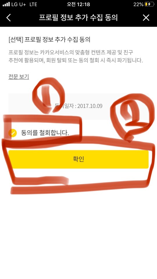 3) [프로필 정보 추가 수집동의]-[동의를 철회합니다]-[확인] 순서로 눌러줍니다. ▼