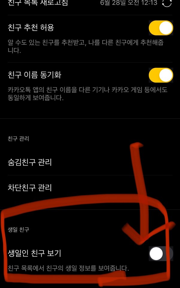 3) [생일인 친구 보기]의 버튼을 눌러 끕니다. ▼