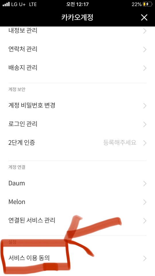 2) [계정 관리]-[서비스 이용 동의]를 클릭합니다. ▼