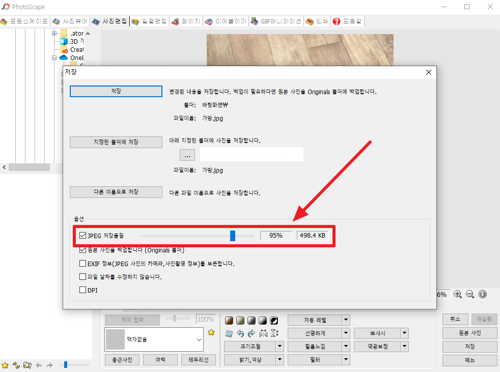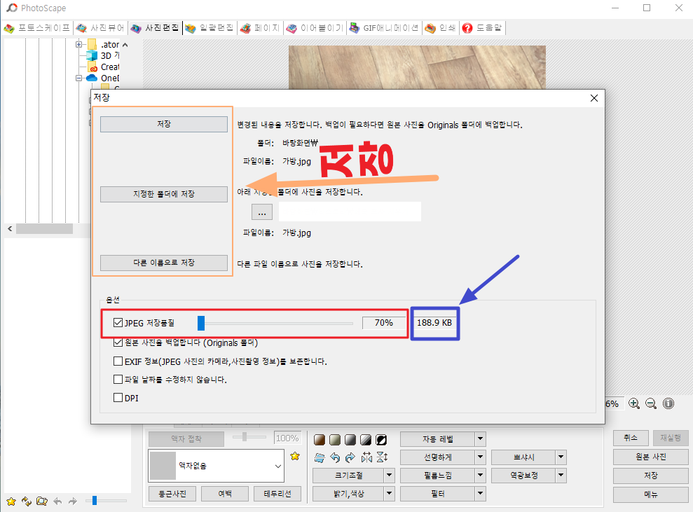 5) 포토스케이프는 저장 옵션에서 저장 품질을 줄일 수 있습니다. 저장 품질을 줄이면 용량이 작아집니다. ▼