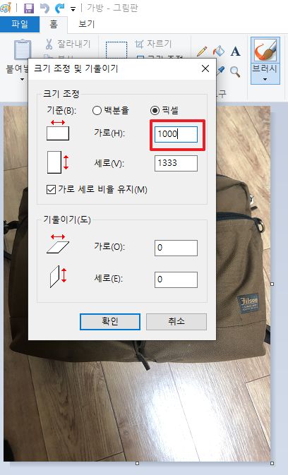 5) 크기 조정 및 기울이기 창에서 [픽셀]을 선택하고, 가로의 크기를 줄여줍니다. 100~1000 까지 원하는 대로 줄이시면 됩니다. 여기서 꼭 [가로 세로 비율 유지]에 체크가 되어 있어야 비율에 맞게 줄여집니다. ▼