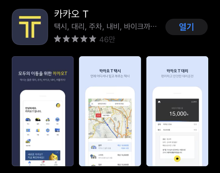 1) 구글 플레이 스토어 또는 앱스토어에서 [카카오T]를 검색하여 어플리케이션을 다운 받습니다.
