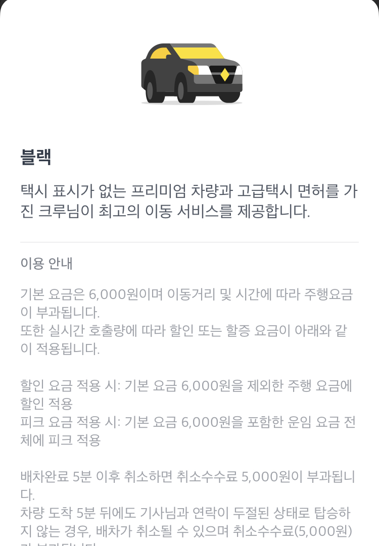블랙 : 택시 표시가 없는 프리미엄 차량이 배차됩니다.