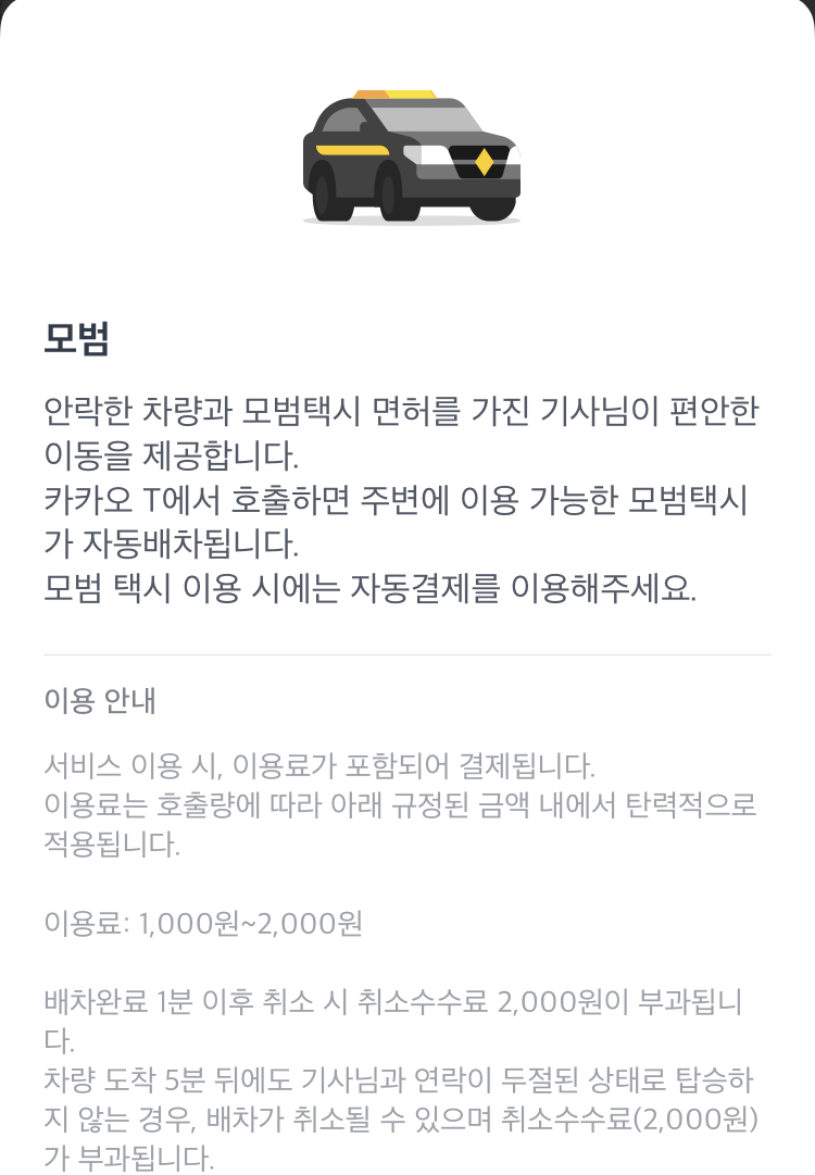 모범 : 모범택시 면허를 가진 기사님의 차량이 배차됩니다.