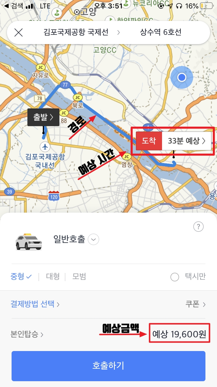 출발지와 도착지, 경로, 도착까지 걸리는 예상시간, 예상금액이 표시되어 다양한 정보를 알 수 있습니다. ▼