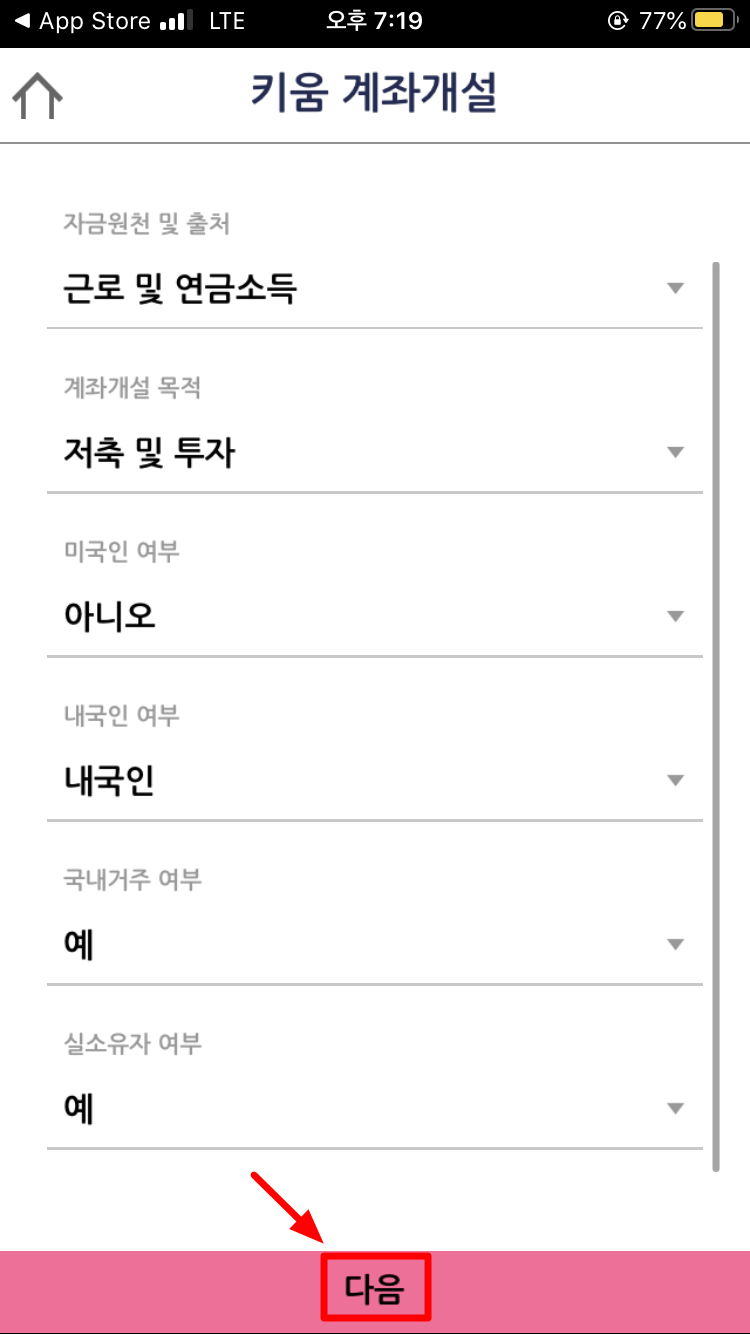 5) 자금원천 및 출저, 계좌개설 및 목적, 미국인 여부 등 여섯가지 기입항목을 선택해주시고 [다음]버튼을 클릭합니다. ▼