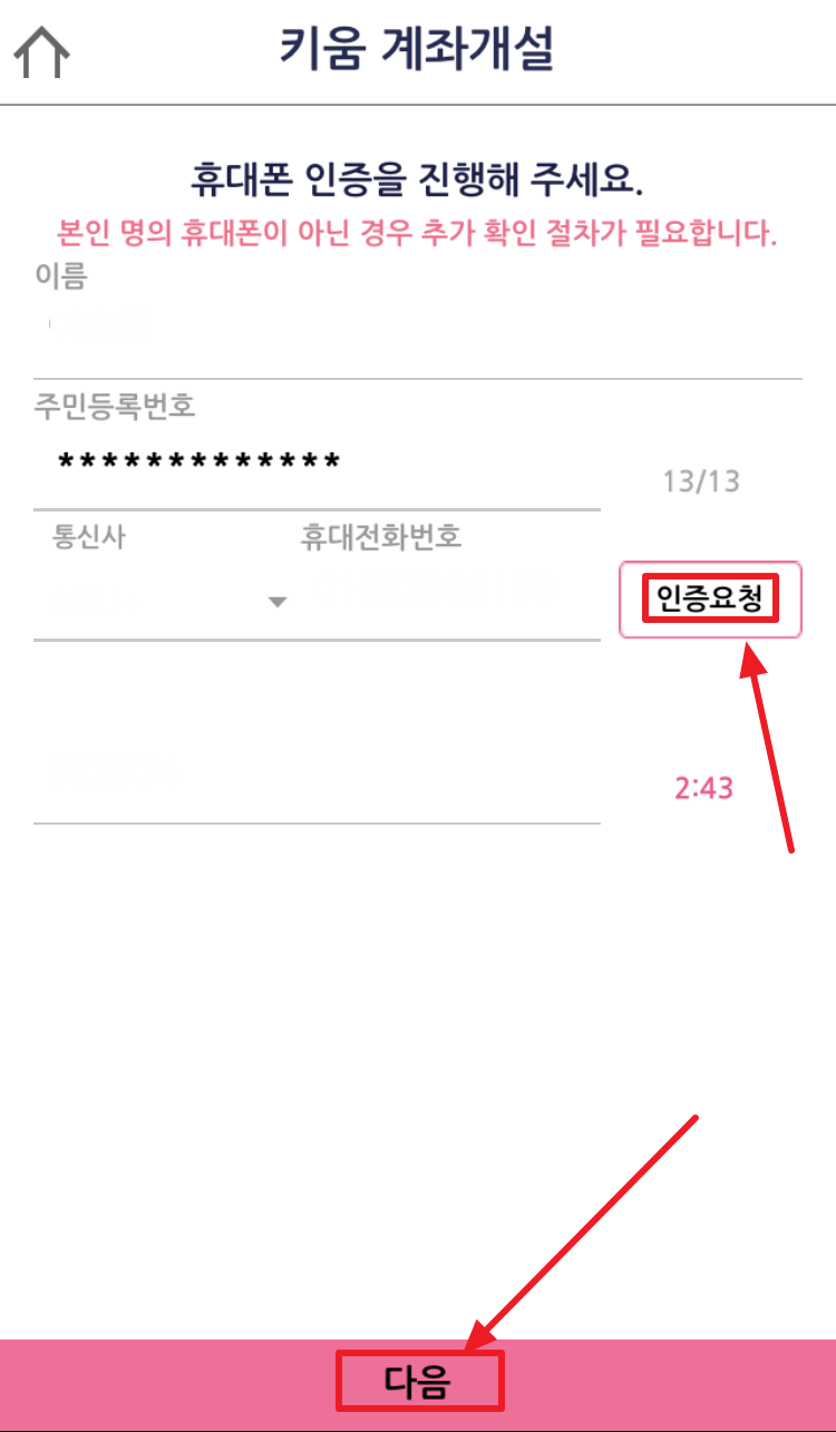4) 이름과 주민등록번호, 통신사, 휴대번호를 기입하고 우측의 [인증요청] 버튼을 클릭하면 문자로 인증번호가 옵니다. 인증번호를 아래에 입력하고 [다음]을 클릭합니다. ▼