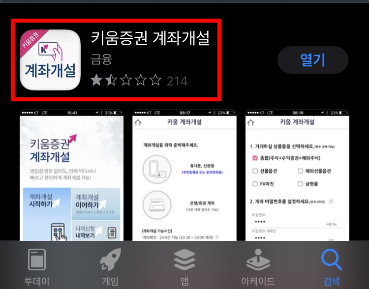 1) 앱스토어 또는 구글플레이스토어에 [키움증권 계좌개설]을 검색하셔서 해당 어플을 다운로드 받습니다.
