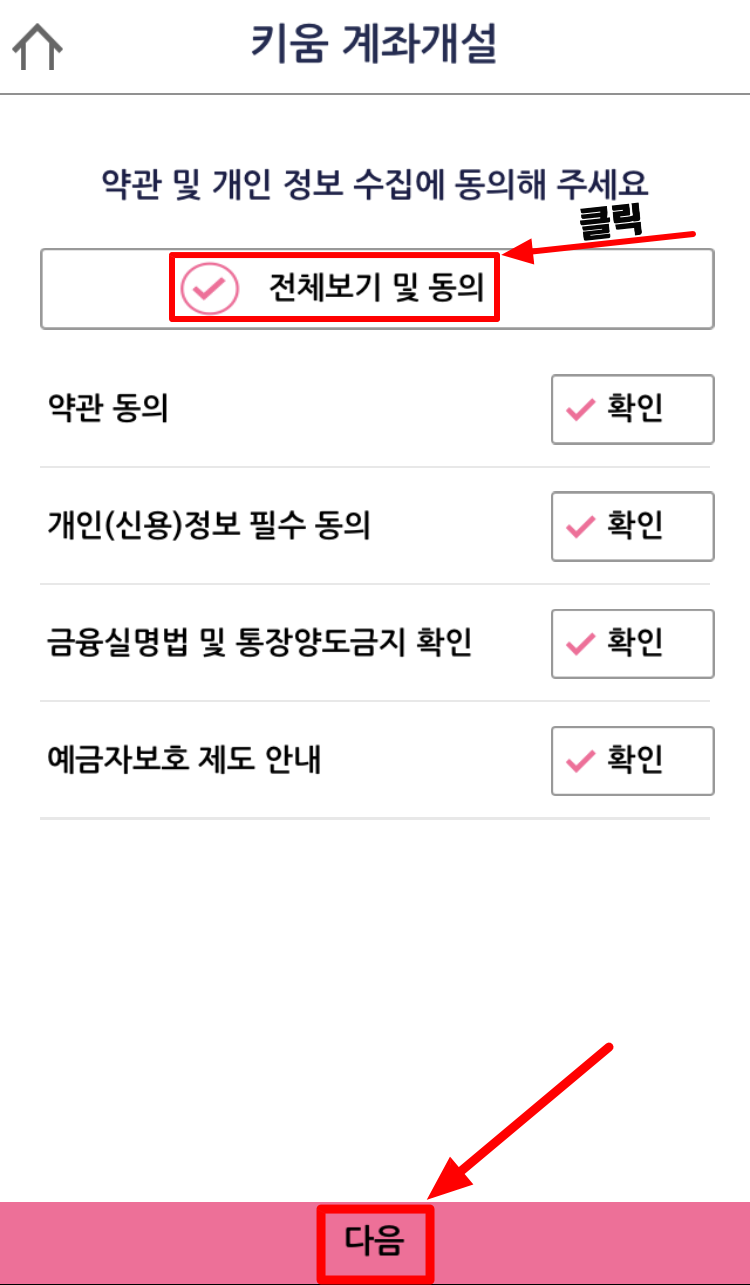 3) [전체보기 및 동의] 버튼을 눌러 약관을 확인하고, 네 가지 목록을 모두 동의하신 후 [다음]버튼을 클릭합니다. ▼