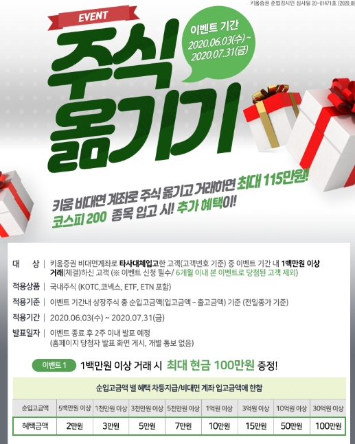 비대면 계좌 개설 후 키움증권으로 주식을 옮기면 주식 매수금액에 따라 현금이 지급되고 있습니다.