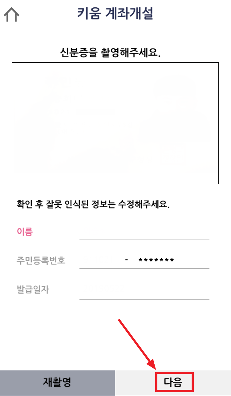 8) 신분증을 촬영해주세요. 라는 창이나오면 빨간 네모박스 부분을 손으로 클릭하면 카메라 촬영하는 화면이 나옵니다. 신분증을 네모박스에 맞춰 촬영하면 사진이 나오고 아래 이름, 주민등록번호, 발급일자에 자동으로 기입이 됩니다.