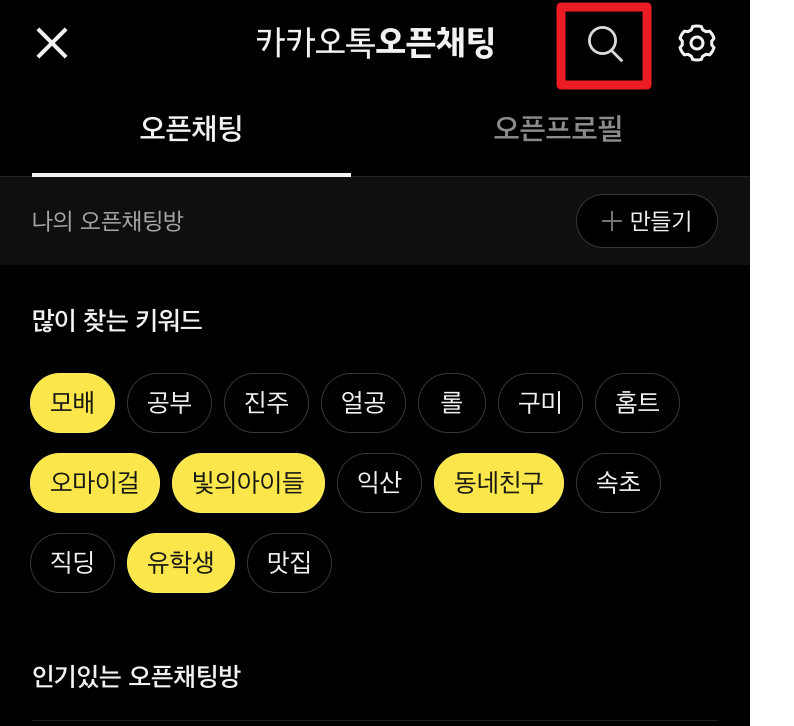10-1) 오픈채팅 창에서 상단의 돋보기 아이콘을 클릭 후 Amongus를 검색하면 어몽어스를 같이할 사람을 구하는 오픈채팅방이 있습니다. 채팅방에 참여하셔서 같이 게임을 즐기시면 됩니다. ▼