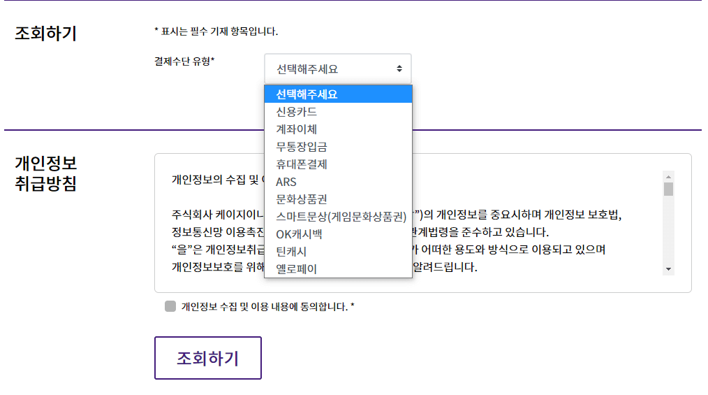휴대폰결제, 무통장입금, 계좌이체의 경우 결제 또는 이체한 날짜를 정확하게 입력해야 하고, 결제 금액을 직접 입력해야 합니다. 조회자가 결제일과 금액, 결제수단을 정확하게 알고 있어야 조회가 가능합니다. 차라리 뱅킹사이트처럼 공인인증서 또는 확실한 본인인증 수단을 갖추고 내 결제내역을 조회할 수 있는 방법이었다면 더 편리했을 것 같다는 생각이 듭니다.