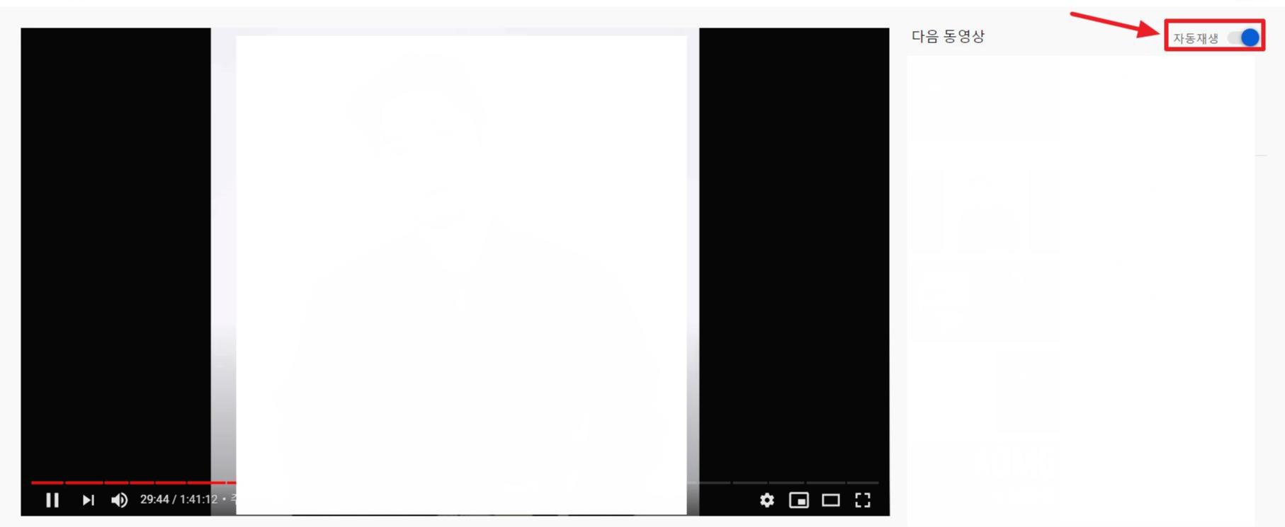 1) 원하는 영상을 클릭하여 시청 화면이 나오면 우측 상단에 [자동 재생] 스위치가 있습니다. 좌측클릭하여 스위치를 끕니다. ▼