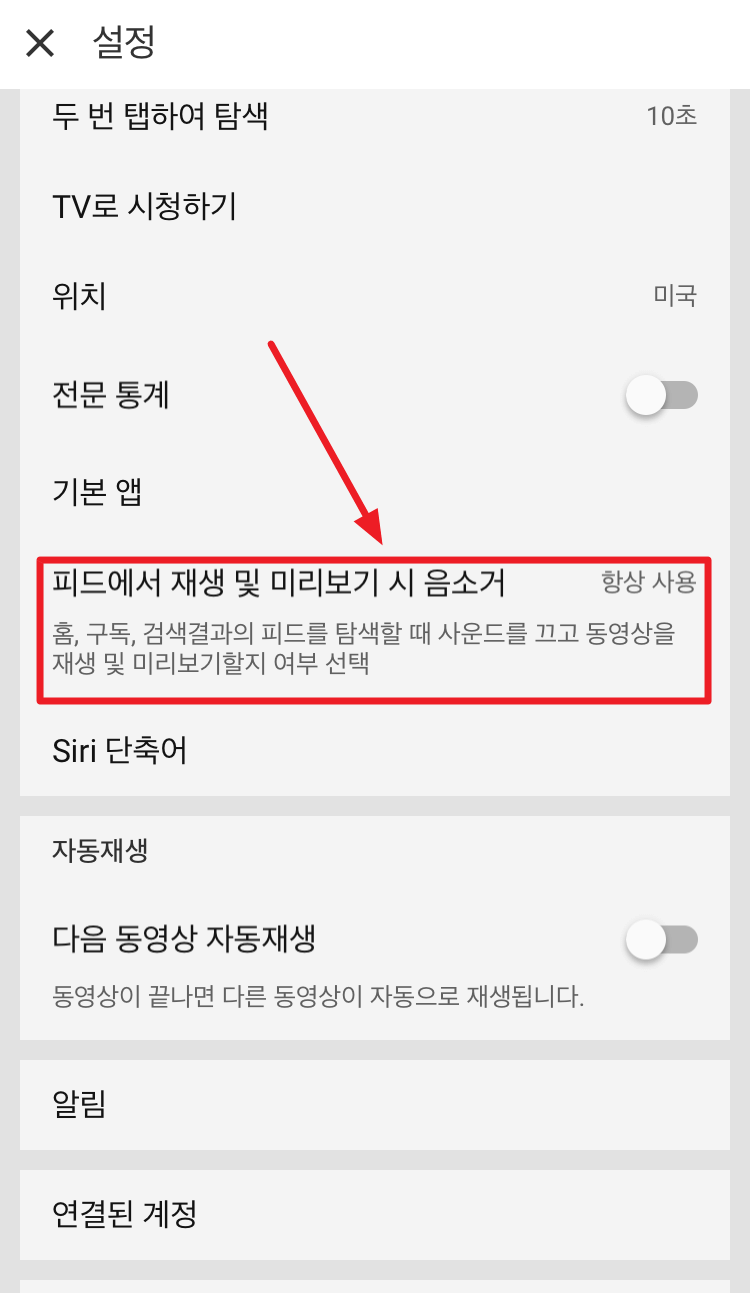 2) 스크롤을 내려 [피드에서 재생 및 미리보기 시 음소거]를 클릭합니다. ▼