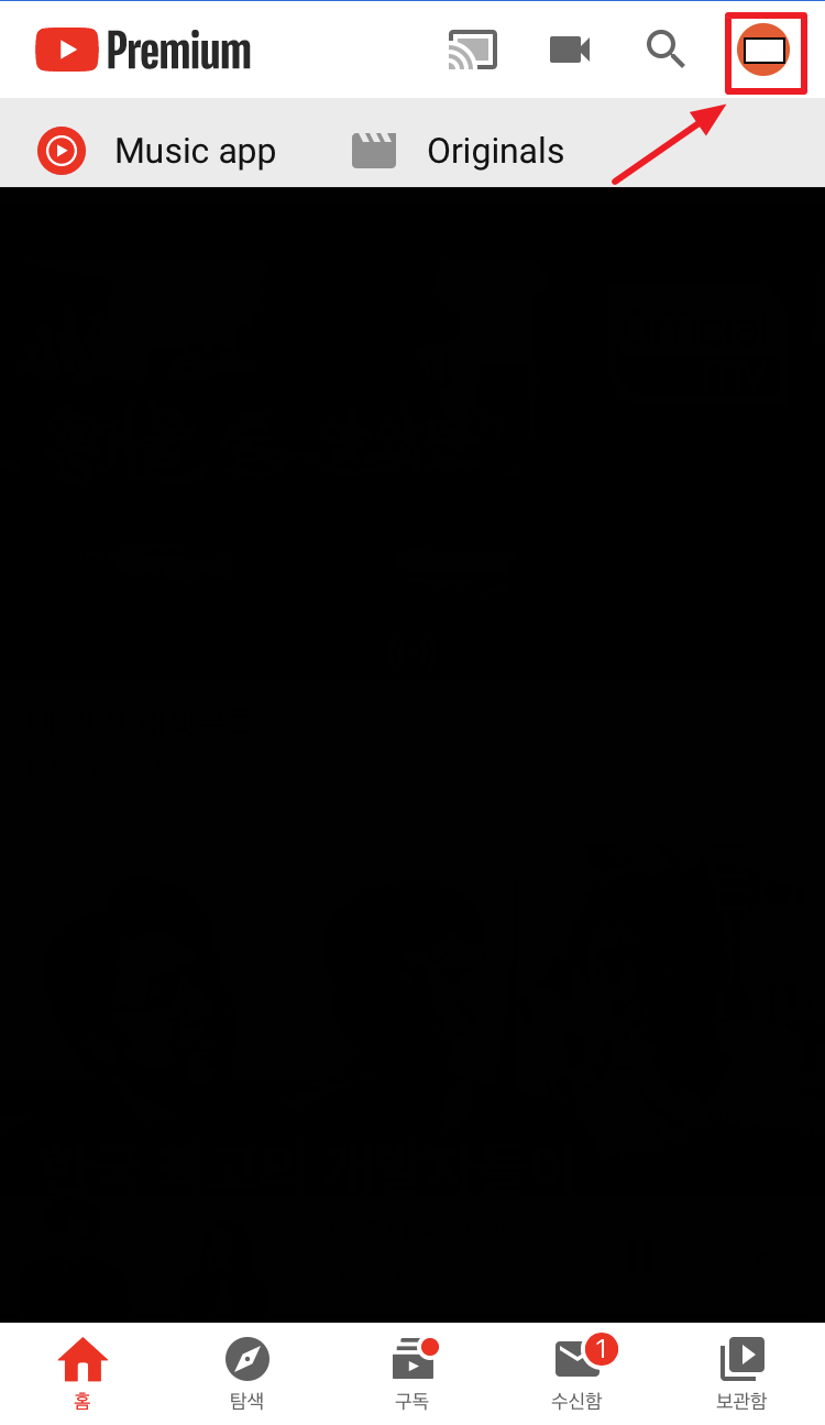 1) 유튜브 어플리케이션을 실행하고 로그인 후 우측 상단의 설정 아이콘을 클릭합니다. ▼
