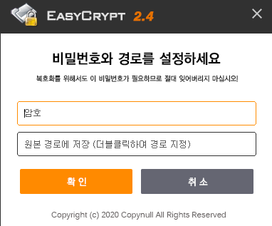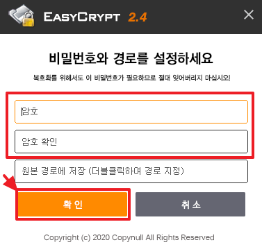 2) 암호와 저장 경로를 지정한 후 [확인] 버튼을 클릭합니다.