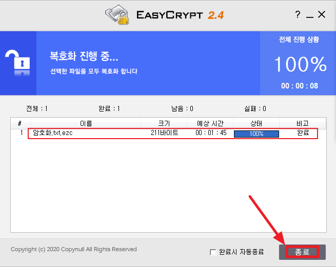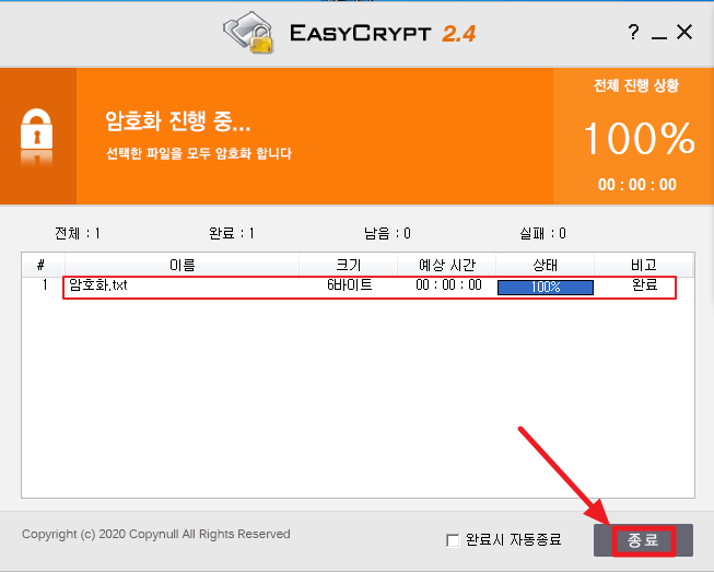 3) 암호화가 완료되면 [종료] 버튼을 클릭합니다. ▼